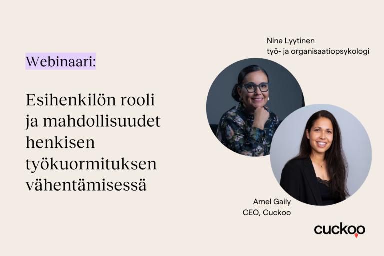 Tässä webinaarissa Cuckoon toimitusjohtaja Amel Gaily ja työ- ja organisaatiopsykologi Nina Lyytinen keskustelevat siitä, miten esihenkilö voi käytännön toimilla vähentää henkistä kuormitusta.