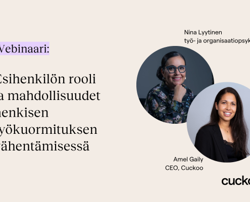 Tässä webinaarissa Cuckoon CMO Tomi Kaukinen, joka itse koki elämää pysäyttävän uupumuksen, keskustelee Karjulan kanssa uupumuksen vaikutuksista yksilöön, organisaatioon ja yhteiskuntaa, sekä mitkä asiat taustalla vaikuttavat järkyttäviin uupumustilastoihin.
